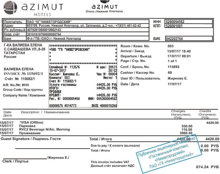 Представители компании полностью готовят все, чтобы не возникало никаких вопросов. Сюда входит полный комплект: • непосредственно сами квитанции – гостиничные чеки с подтверждением Ижевск, например; • счёт-фактура; • ксерокопии официальных документов о компании; • оригинальный прейскурант; • форма 3Г с актом об оказанных услугах.