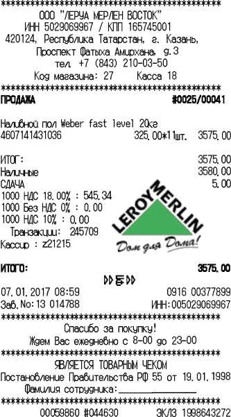 Реквизиты кассового чека содержат: • Название организации, которая выдает чек; • Номер печатно-кассовой машины; • Код ID фирмы; • Дата и время приобретения товара; • Номер кассового документа; • Общая сумма покупки; • Признак фискального режима.