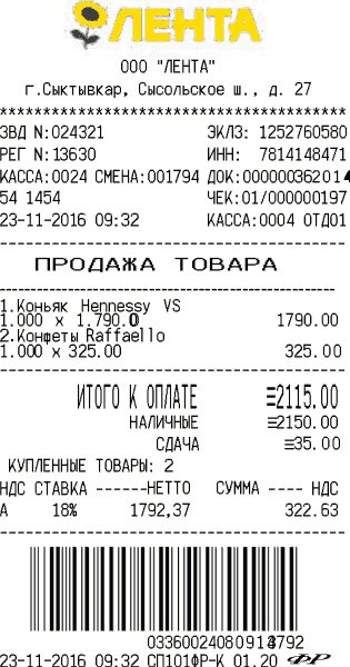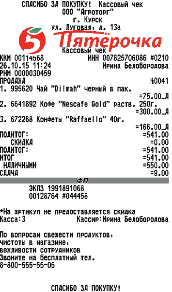 Товарный чек магазина должен иметь такие реквизиты: • Название компании или ИП, в которых сделана покупка. • Номер кассового устройства. • Код плательщика налогов. • Точное время покупки. • Номер чека. • Стоимость продукта. • Признак фискального режима.