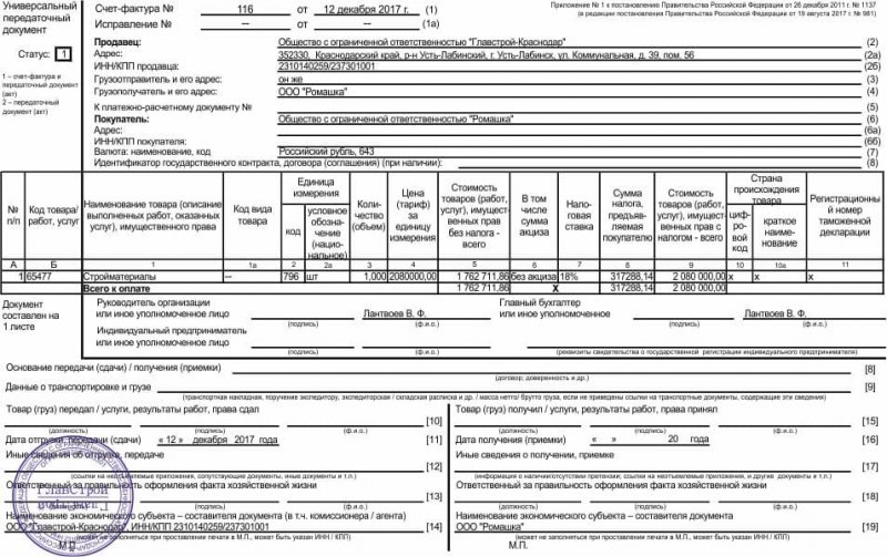 В хозяйственной деятельности УПД 2018 выдается в случае: • Разгрузки предметов сделки; • Сдачи работ и готовых объектов; • По факту реализации товара или услуги; • При передаче прав на имущество.